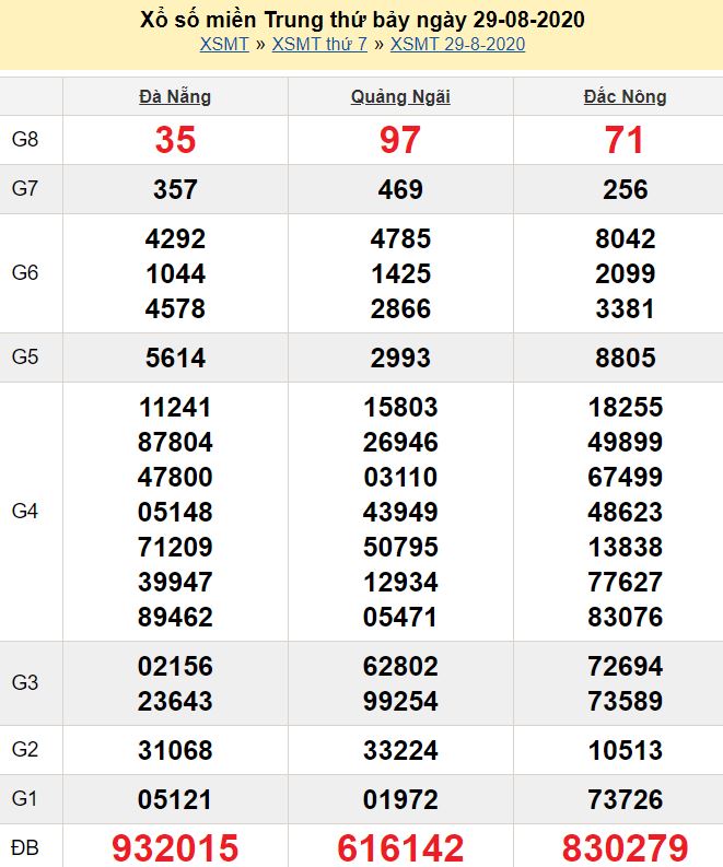 Dưới đây là bảng kết quả xổ số miền Trung cho ngày 05/09/2020.